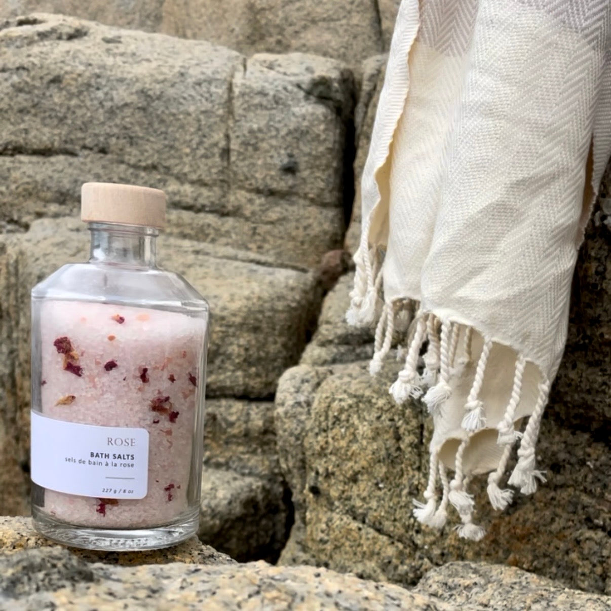 A clear glass bottle with a wooden cap containing rose bath salts. The label is minimalistic with the brand name 'ROSE' and the product name 'BATH SALTS' on it.